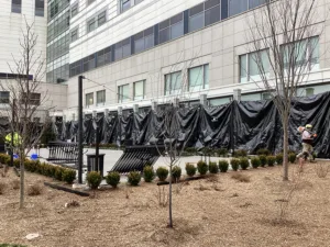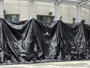 The system includes approximately 1,500 feet of reinforced concrete perimeter floodwalls along with roughly 500 feet of deployable protection. These deployable barriers are Flex-Gate® Bottom Deploy Flood Barriers from PS Flood Barriers®, stored at the point of use and ready for rapid deployment when a storm is approaching. Because they deploy upward from below, they remain concealed during normal operations, preserving access and appearance while standing ready to protect critical openings.